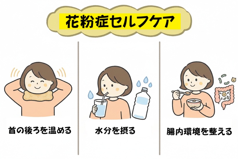 • 首の緊張:首周りの筋肉が緊張していると、鼻粘膜への血流が悪くなり、鼻詰まりや炎症を助長してしまいます。
