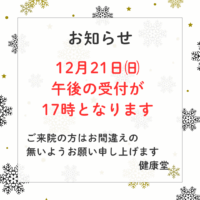 12月21日は受付が17時となります。 ご来院の際は、お間違いのないようお願い致します。 皆様にはご迷惑おかけしますが、ご了承ください。 急な痛みで悩んでいる時は、 「私の症状をまず見て欲しい!」 「予約コースはマッサー …