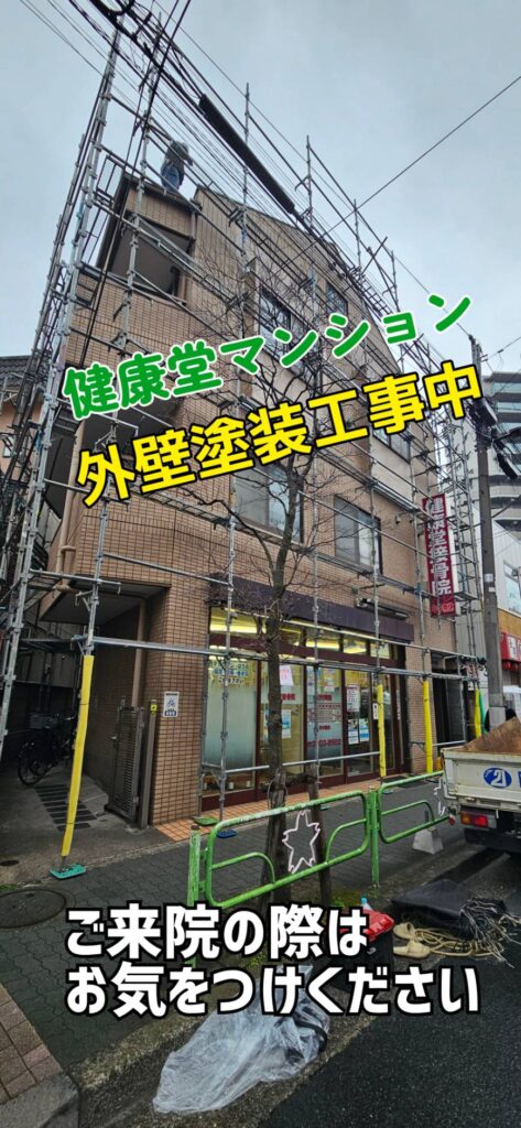 現在、当院が入居しております「健康堂マンション」の外壁工事に伴い、建物周囲に工事用足場が設置されております。🚧