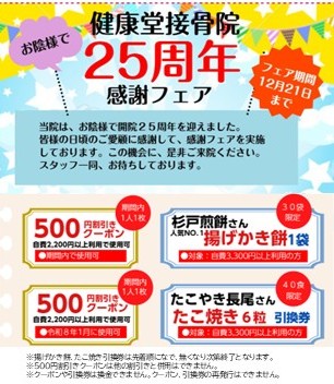 健康堂接骨院では、25周年を記念し、期間限定で特典をご用意しております。