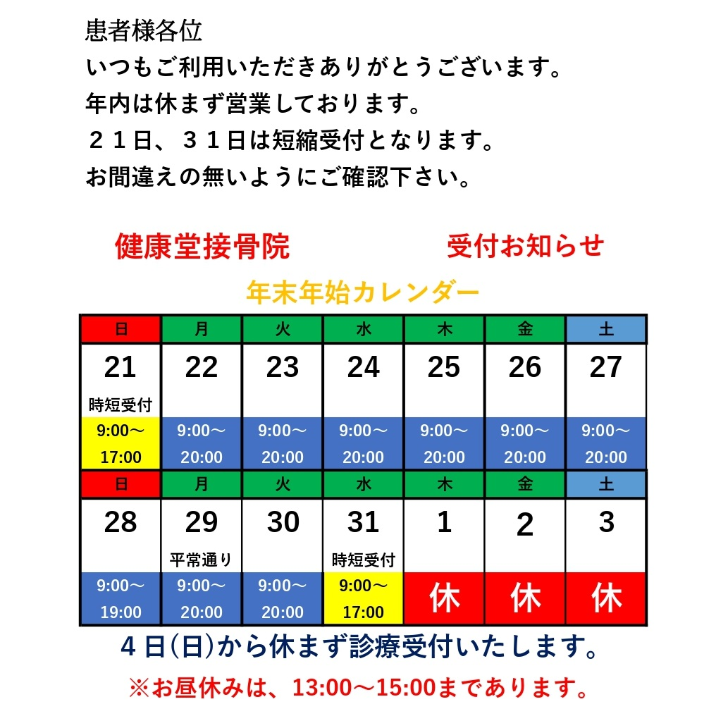 12月は当院の都合により2日間(21日、31日)受付時間を短縮しての受付時間となります。