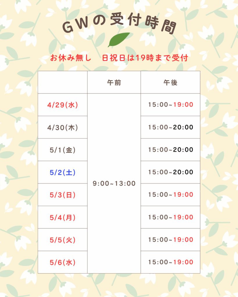 今回はゴールデンウイークの受付時間についてお知らせします。