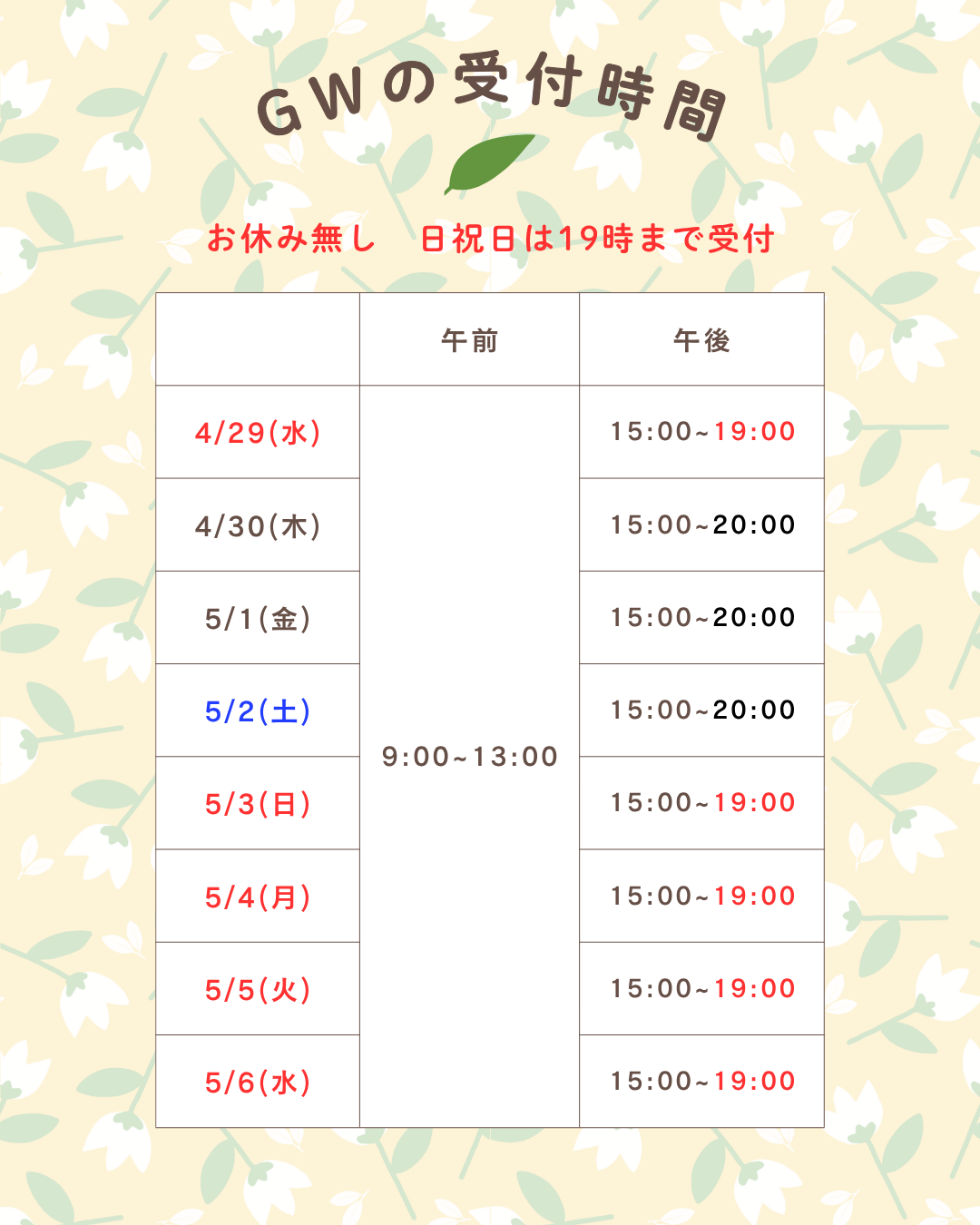 | 4月30日 5月1日、2日 | 9:00~13:00 15:00~20:00まで |